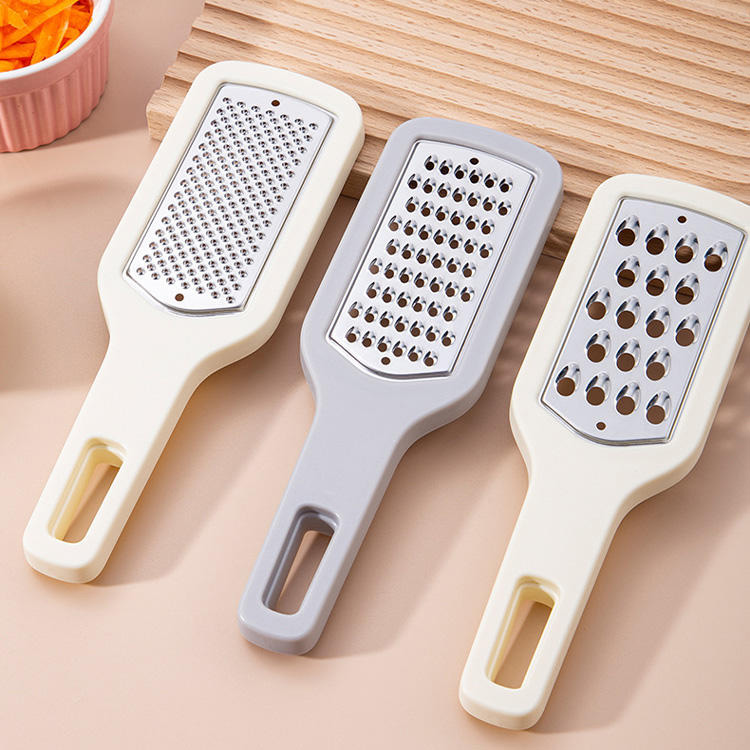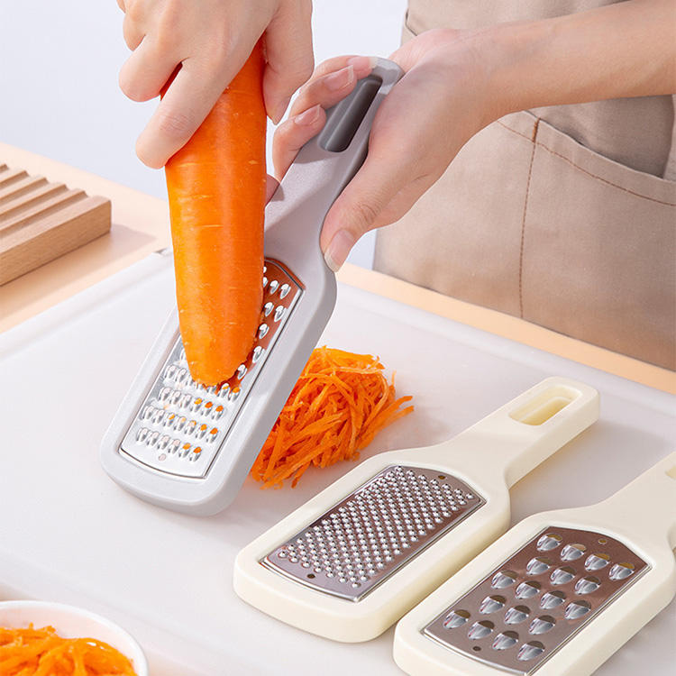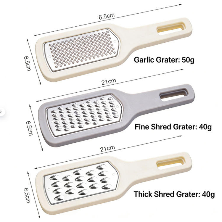 This product is a multi-functional three-in-one stainless steel grater, combining coarse grating, fine grating, and slicing functions into one. It effortlessly handles various fruits and vegetables, offering versatile use and efficient kitchen space savings. The blade head is crafted from premium food-grade stainless steel, featuring a sharp and durable edge resistant to rust, ensuring smooth cutting without sticking. It easily meets daily meal prep needs.